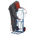 Lekki wózek do paczek, składany Spawana konstrukcja stalowa; składany na 2 części w celu ułatwienia transportu; łatwe odblokowywanie i unieruchamianie przy pomocy linki; uchwyt z miękkim tworzywem sztucznym; malowanie proszkowe farbą RAL 5010 (niebieski); wysoka odporność na uszkodzenia mechaniczne; koła pneumatyczne, felga stalowa z precyzyjnym łożyskiem kulkowym i kołpakiem z tworzywa.